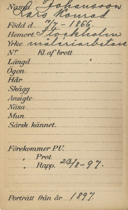Fotot togs i samband med att måleriarbetaren Lars Konrad Johansson förhördes av polisen den 23 augusti 1897. Han hade ertappats på Ladugårdsgärdet i en intim stund med Frans Albert Pettersson. Protokollen från polisförhöret och den påföljande rättegången kan du läsa om du klickar på en av länkarna nedan.