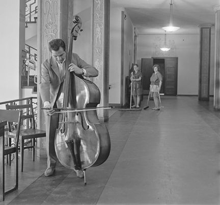 Konserthuset. Geza Farkas övar kontrabas i promenoaren före restaureringen
