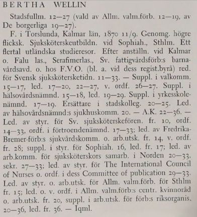 Bertha Wellin (1870-1951) var sjuksköterska till yrket. 1912-19 tillhörde hon Allmänna valmansförbundet, 1919-27 De borgerliga.