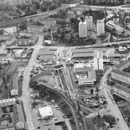 På bilden syns både den gamla vändhållplatsen för spårvagnar och den nya tunnelbanestationen Fruängen som är under uppförande. Kvarteret Direktrisen till höger om tunnelbaneperrongen.