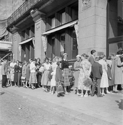Tegelbacken 2, Centralpalatset. Runt spårvägens kortcentral slingrade sig en kö av skolbarn, för att köpa skolkort till spårvagnen.