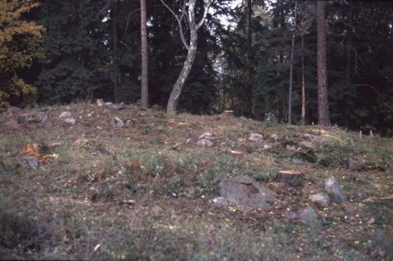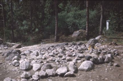 Stensättning, rund, 7,5 meter stor och 0,8 meter hög, med tydlig kantkedja bestående av 0,35-0,6 meter stora stenar. Anläggningen var uppbyggd av 0,2-0,6 meter stora stenar lagda i 3-4 skikt med mylla mellan stenarna. Botten utgjordes av pinnmo och berg i SV. I anläggningens S delar påträffades ett ca 3 x 6 meter stort och ca 0,3 meter tjockt brandlager med sot och kol, innehållande ett järnfragment, keramik, harts, brända ben, tänder och kol.