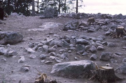 Stensättning, rund, 4 meter i diameter, 0,5 meter hög, uppbyggd av ca 0,4 meter stora stenar, lagda i 1-2 skikt med fyllning av mylla. Botten utgjordes av lera. I anläggningens centrum, något orienterad mot NV, påträffades ett 2,5 x 3 meter stort och 0,36 m djupt brandlager med sot och kol, innehållande nitar, järnfragment, kamfragment, keramik, harts, bränd lera, lerklining, slagg, brända ben och kol.