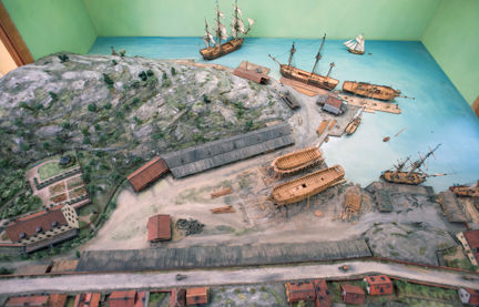 I modellens mitt finns två fartyg under byggnad på stapelbäddar. När skroven är färdiga kommer de att sjösättas, något som i äldre tid kallades för stapelavlöpning. Vid kajen i Tegelviken ligger bland annat en galeas, ett mindre tvåmastat handelsfartyg. I viken bogseras ett masttimmer av en roddbåt.
