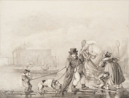 Skämtsam bild (stentryck) av Fritz von Dardel (1817-1901) som visar en familj på vattenskidor. I bakgrunden ror två roddarmadammer en båt.