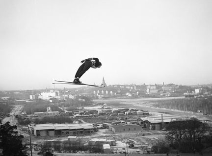 Backhoppning i Hammarbybacken. Utsikt mot Södra Hammarbyhamnen och östra Södermalm. Norrmannen Odd Westby hoppar