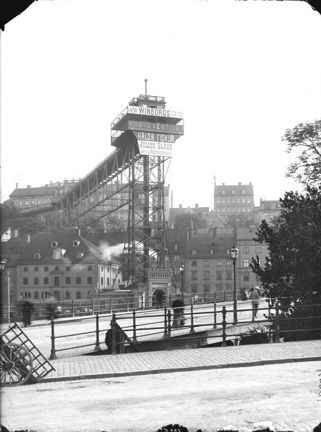 Ställde sig i kön av människor på väg upp mot Mosebackes nöjen och Söders berg, puffades i ryggen av ivriga väntande. Trängde med in i hissen och lämnade sin pollett som kostat fem öre. Lyckades ta sig fram till glasrutan så hon kunde se ut. Och plötsligt steg hissen med ångmaskineriets hjälp, nu var det för sent att ångra och hon kände ilningarna, den svalkande skräcken. Å, hon gled genom luften, högt över slusstraktens alla hus.