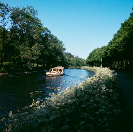 Vy från Djurgården (strax öster om Djurgårdsbrunnsbron) åt öster mot Djurgårdsbrunnskanalen. Rundtursbåt på väg mot Lilla Sjötullen