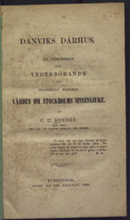 Danviks dårhus : en uppfordran till vederbörande att tidsenligt reglera vården om Stockholms sinnessjuke / af C. U. Sondén