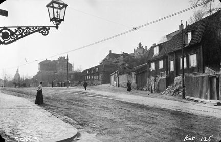 Folkungagatan västerut från nr. 77, nu 129. Erstagatan och Ersta sjukhus. I fonden Navigationsskolan med byggnadsställningar. Nu Stigbergsparken