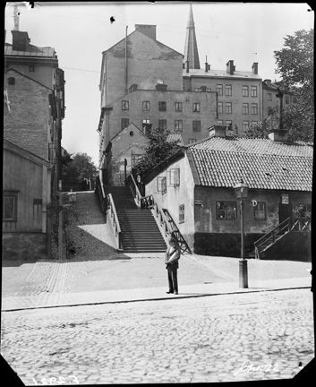 Jutas Backe nr 2-6 från Roslagstorg, nuvarande Birger Jarlsgatan. I bakgrunden syns Johannes kyrktorn. Kv. Såpsjudaren och Höjden