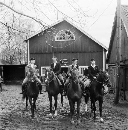 Sockenvägen/ Enskede Gårdsväg 2-4, Enskede Ridhus/Ridskola. Fyra ryttare på sina hästar