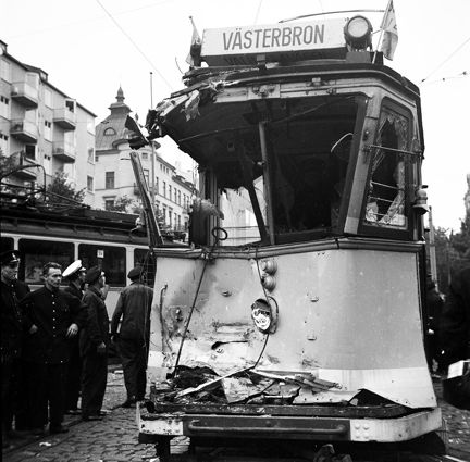 Odenplan. En spårvagnsolycka mellan två spårvägståg, linje 12 och linje 4, har inträffat