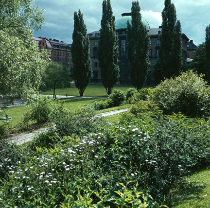 Observatorielunden; från bäckfåran mot Handelshögskolan. Fyra stora popplar i förgrunden