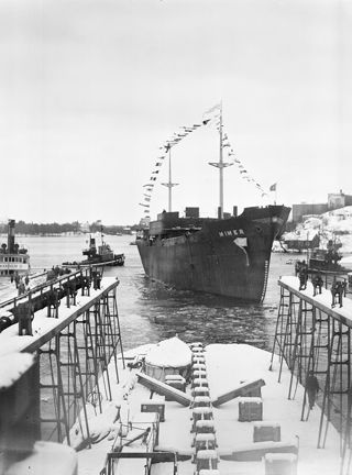 Finnboda varv. Fartyget Mimer sjösätts. Rederi Sveas (Stockholms Rederi AB Svea) nybyggda lastmotorfartyg, den fjärde i serien av liknande fartyg