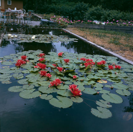 Näckrosdammar med röda och vita näckrosor på Rosendals terrass
