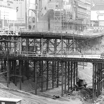 Vy mot kv. Åskslaget under pågående rivning. I förgrunden provisoriska broar för fotgängare och trafik