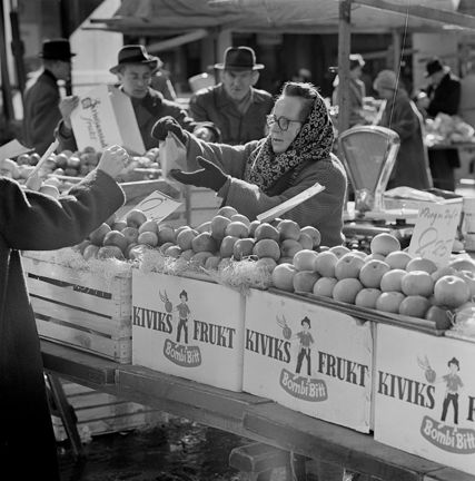 Fruktförsäljning på Hötorget. En torgmadam med sjalett står vid en rad äppellådor med texten ""Kiviks frukt""