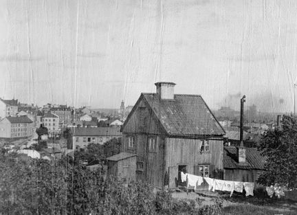 Lundagatan 14 på Skinnarviksberget, i folkmun kallad Tietzens fåfänga. Vy österut med Maria kyrkas torn i fonden. Då kv. Somens Kvarn Mindre. Nu Gamla Lundagatan 14, kv. Haren