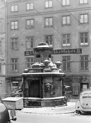 Brunkebergspumpen på Brunkebergstorg. Pumphuset flyttades till Stortorget 1953. I Brunkebergstorg 9 låg D. Bondarevskys Skyltfabrik