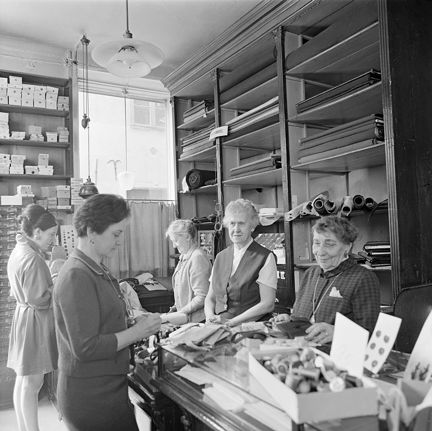 Tyska Brinken 22. AB George Lindström Sybehör och Knappaffär. Kunder i butiken