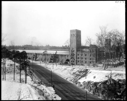 Stockholms Stadion, fasaden mot Sturevägen med Klocktornet, vintertid.