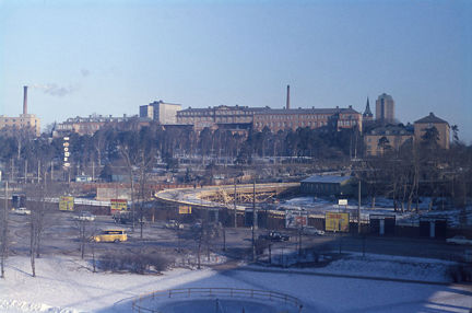 Vy från Västerbrons viadukt mot S:t Görans sjukhus. I förgrunden parti av Rålambshovsparken. Trafikrampen Västerbronedfarten under byggnad. Nuvarande Rålambshovsbacken