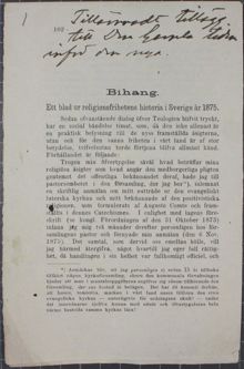 Undertecknad, som öfvergått till den positivistiska religionen, får härmed förklara sig ej kunna tillhöra den evangeliskt-lutherska kyrkan, hvarför jag får anhålla om att derifrån varda skild.