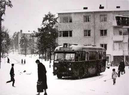 Bild från ett vintrigt Hammarbyhöjden, troligen från slutet av 1950-talet.
