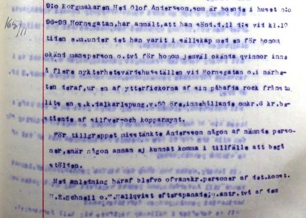 /…/då målsegaren återkommit o. betalt den intagna förtäringen, de samtliga begifvit sig ut, hvarefter Isberg narrat målsegaren med sig in i portgången till n:o 13 Ringvägen, hvarvid Andersson o. Felsman gått Hornsgatan i riktning mot Ad. Fr. Torg [Mariatorget];