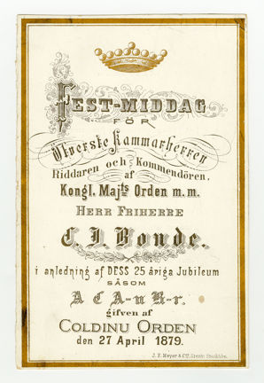 Följande inbjudan med program och matsedel ger en bild av hur högreståndspersoner roade sig under mitten av 1800-talet. Mycket möda lades ner på att utforma ett så vackert inbjudningskort som möjligt och ett musikprogram som var tilltalande för alla smaker.