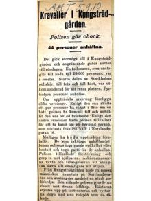 Tidningen Social-Demokraten rapporterar om ett upplopp i Kungsträdgården hösten 1910.