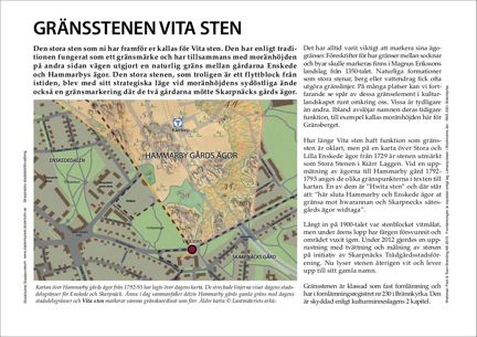 Den stora sten som ni har framför er kallas för Vita sten. Den har enligt traditionen fungerat som ett gränsmärke och har tillsammans med moränhöjden på andra sidan vägen utgjort en naturlig gräns mellan gårdarna Enskede och Hammarbys ägor. Den stora stenen, som troligen är ett flyttblock från istiden, blev med sitt strategiska läge vid moränhöjdens sydöstliga ände också en gränsmarkering där de två gårdarna mötte Skarpnäcks gårds ägor.