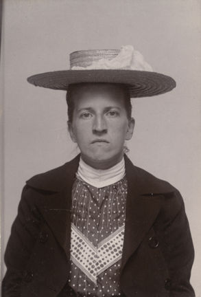Det här fotografiet är taget 1905 hos polisens kriminalavdelning i Stockholm. Det föreställer Alva Nordberg som blivit häktad misstänkt för barnamord. Alva var född den 15 juli 1876 och är på bilden 29 år gammal. Hon var gift och hade vid tidpunkten två biologiska barn och flera fosterbarn i sin vård.