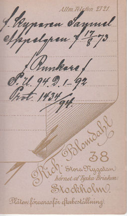 f. kyparen Samuel Appelgren f. 17/8 73 /Runkare/