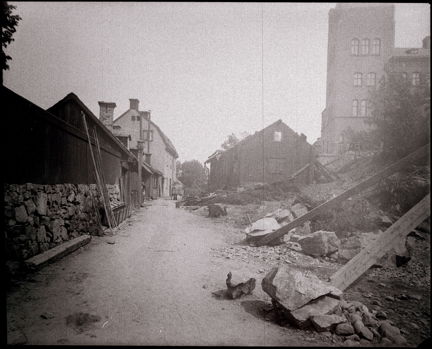 Stigbergsgatan österut från Stigbergsgatan 23. I bildens mitt rivs äldre trähusbebyggelse och till höger syns Navigationsskolan.