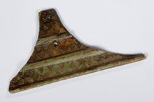 En dekorerad bronsflöjel från 1000-talet e.Kr., bestående av en ca 15x15 cm stor plåt med fästanordning. Den har antagligen använts som väderflöjel på ett hus eller på ett skepp. På flöjelns bägge sidor finns geometriska mönster och figurer inristade, bland annat en häst, en människofigur och en fågel. På flöjelns ena sida tycks människofiguren sitta på hästen med ett svärd i den ena handen och en fågel i den andra. På flöjelns andra sida är hästen, människofiguren och fågeln åtskilda. Det förekommer även andra figurer och mönster men de centrala motiven i dekoren är tydligt och klart hästen, människan och fågeln. Avbildningarna på flöjeln återger antagligen en jakt med en upptränad rovfågel, sannolikt en falk eller hök. Scenerna visar troligen två moment av själva jakten, dels inledningen där en ryttare (falkeneraren) har fågeln sittande på sin arm, och dels avslutningen på jakten då fågeln tagit sitt byte och ryttaren klivit av hästen för att hämta fågeln och bytet.