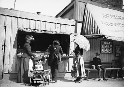 Marknadsstånd på Skansen med marknadsbesökare och barn i skrinda. Till höger under markisen har "Amerikanska - Fotografi Ateliern" sin fotoateljé.