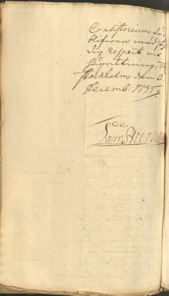 Såsom Predikanten wid denne Stadsens Rasp- och Spinhus, Hr Olof Sundström, gifwit Consistorio wid handen, huruledes hos den der på Spinhuset warande Anna Gustafsdotter, hwilken ock plägar nämnas för bittra lagen, skola sig esomoftast infinna de så kallade gråkoltar, och andra personer som äro af de nu för tiden, Gudi klagat, gångbara nya wilfarelser