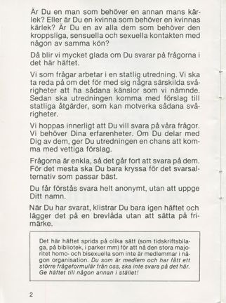 Den livssituation som homosexuella då befann sig i gjorde kontakt med de svarande svår, det var helt enkelt inte särskilt lätt att leva öppet. Bland de som svarande finner vi män och kvinnor, unga och gamla, hög- och lågutbildade. Syftet med undersökningarna var att få en uppfattning om hur homosexuella upplevde sin situation och omgivningens attityd till homosexualitet. De delar av undersökningen som riktade sig till homosexuella utfördes genom enkätundersökningar och anteckningar från telefonsamtal till RFSL:s telefonjour.