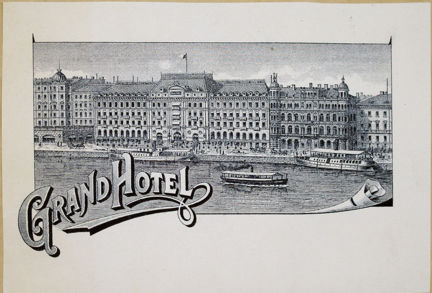Brevhuvud tryckt i blått och svart, Grand Hotel med vattnet i förgrunden samt text.