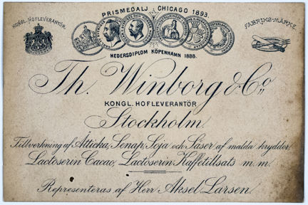 På trycket står: Th. Winborg & Co. Kongl. Hofleverantör. Tillverkning af Ättika, Senap, Soja och Såser af malda kryddor. Lactoserin, Cacao. lactoserin kaffetillsats m.m. Representeras af Herr Aksel Larsen.