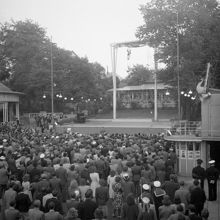 Affisch tryckt i rött, blått och svart med bild av ett ansikte, scen med männniskor på, Storbritanniens flagga samt text. På affischen står: Ivy Benson med sitt "Star Band". Sommarens största evenemang. Direkt från London. Gästkonserter 15-21 Juli. Obs! Endast dessa sju dagar. Tivoli Görna Lund.
