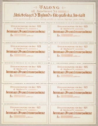 Talong med tio utdelningskuponger för åren 1921 – 1930, tryckt i rött och svart med texten Aktiebolaget J. Nylunds Litografiska Anstalt.