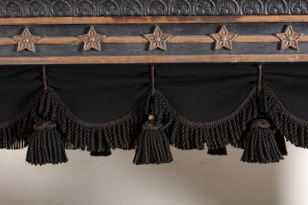 Begravningsvagnen är fem meter lång och nästan tre meter hög, med kuskbock och större bakhjul. Träet och draperierna runt båren, liksom de tofsar som hänger längs med överkanten, är svarta. Begravningsvagnens sidor pryds av blommande förgyllda kallor kring davidsstjärnan, den sexuddiga stjärna som varit symbol för judendomen sedan medeltiden. Kallan kan symbolisera renhet, återfödelse och hängivenhet (Bild 2, 3 och 6).