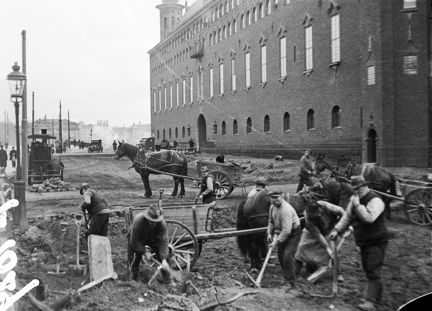 Många mankrafter behövdes under hela byggperioden. Spett, spadar och kärror är den utrustning som används för att jämna marken från stenar och rötter. Bilar skymtas i bakgrunden, men på byggarbetsplatsen var häst och vagn fortfarande det vanligaste hjälpmedlet.