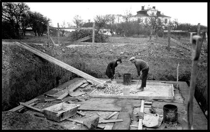 Gjutning av grundplatta till hus i Ängby småstugeområde. I bakgrunden Stora Ängby Gård