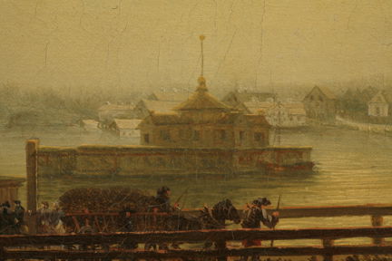 Målningen visar gamla Norrbro som var en gata över Helgeandsholmen med två broar. En bro gick från Gustav Adolfs torg på Norrmalm och en anknöt till Mynttorget i Gamla stan. Det är Mynttorget vi ser till vänster. Gamla Norrbro försvann i samband med att byggnaderna på Helgeandsholmen revs för att ge plats för byggandet av Riksdagshuset och Riksbanken. Detta skedde 1897.