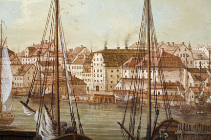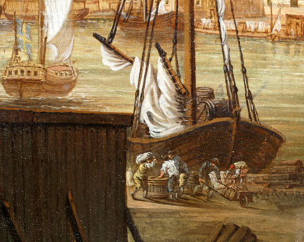 Förr kallades den östra delen av Bastugatan för Bödelsbacken. I förgrunden ses arbetare på lastkajen. Detaljbilden som följer visar arbetare som lossar varor från en mälarskuta med gods i stora fat.