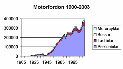 Statistik. 1905 ägde stockholmarna 177 personbilar. Antalet motorfordon har sedan vuxit mycket kraftigt under perioden. 2003 fanns 324 000 registrerade personbilar i Stockholm. Det finns tre tydliga hack i kurvan. Under andra världskriget 1939-45 var det få motorfordon. Senare men inte lika kraftiga vågdalar inträffade kring 1974 och 1994. Alla registrerade motorfordon är inte i trafik. Vid årsskiftet 2004/2005 fanns 279 000 personbilar i trafik i Stockholms stad och 754 000 i Stockholms län. Det motsvarar 364 personbilar i trafik per tusen invånare i Stockholms stad. Stockholm är en av de kommuner i Sverige som har minst antal inregistrerade personbilar per invånare.